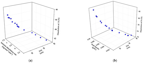3D plot of high-shear wet granulation process: (a) relationship among D10, intrinsic dissolution rate, and dissolution at 1 h, (b) relationship among D10, bulk density, and dissolution at 3 h.