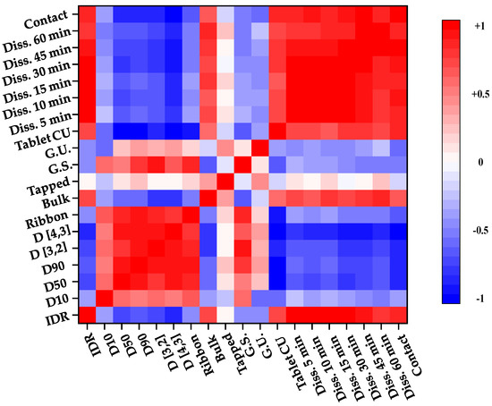 Pearson correlation coefficient of roller compaction process. Contact: contact angle; Diss.: dissolution; G.U.: granule uniformity; G.S.: granule strength; Tapped: tapped density; Bulk: bulk density; Ribbon: ribbon density; IDR: intrinsic dissolution rate.