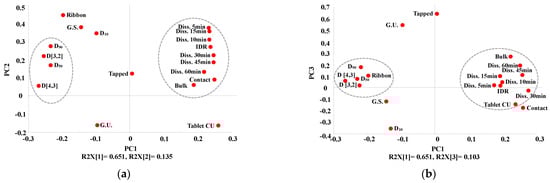 Score scatter plot of roller compaction: (a) PC1 and PC2, (b) PC1 and PC3. The group within the gray dotted lines located opposite each other indicate a negative correlation. Contact: contact angle; Diss.: dissolution: G.U.: granule uniformity: G.S.: granule strength; Tapped: tapped density; Bulk: bulk density; Ribbon: ribbon density; IDR: intrinsic dissolution rate.