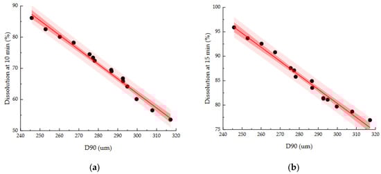 Fitted line plot of roller compaction process: (a) relationship between D90 and dissolution at 10 min, (b) relationship between D90 and dissolution at 15 min. The black point represents experimental data, the red line represents the best-fitted regression of data, the red-filled line is the 95% C.I. band, and the pink-filled line is the 95% P.I. band.