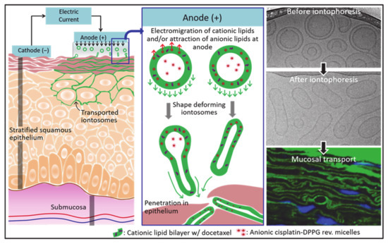 The results presented here demonstrate that two physicochemically incompatible chemotherapeutic agents, CDDP and DTX, could be encapsulated in electroresponsive shape-deformable iontosomes and, furthermore, that this could be achieved at high entrapment efficiencies. The iontosomes carried a cationic surface charge with flexible lipid bilayers; however, these properties were not sufficient for their spontaneous penetration into the mucosa. The application of iontophoresis led to shape deformation of the iontosomes and significantly enhanced their mucosal penetration through the intercellular spaces between epithelial cells—visualization of the penetration pathway was achieved using CLSM. Quantification of the amounts of CDDP and DTX present in the mucosa after passive and iontophoretic administration showed that already after 10 min, there were 67.7- and 56.6-fold increases in mucosal deposition upon current application. The ratio of the amounts of the two drugs present in the mucosa was similar to that found in the iontosomes, suggesting that the deposited CDDP and DTX had been delivered through the electrotransport of intact iontosomes into the membrane. The combination of iontosomes with electrically-assisted delivery appears to be a promising method for delivering multiple chemotherapeutics selectively to oral mucosa and offers a non-invasive targeted approach for the treatment of cancers that also limits their systemic absorption and the associated risk of off-site side effects.