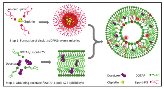 Formulation of electroresponsive iontosomes; cisplatin (CDDP) was formulated into the anionic reverse micelles using dipalmitoyl-sn-glycero-3-phospho-rac-glycerol sodium (DPPG) (red) and docetaxel (DTX) was loaded in the cationic lipid bilayer of 1,2-dioleoyl-3-trimethylammonium-propane soybean phosphatidylcholine (DOTAP-Lipoid-S75) (green). Then, the iontosomes were obtained by hydrating the cationic lipid bilayer with the CDDP-DPPG reverse micelles.