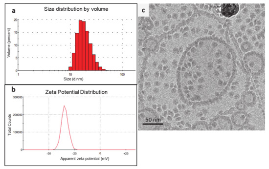 In the modified method, CDDP was first formulated into reverse micelles using an anionic lipid, DPPG. The formation of reverse micelles was driven by the aquation of CDDP, which is a process involving hydrolysis of the chloride atoms in CDDP and their replacement by water molecules. The aquated CDDP carried two positive charges, and hence, it instantaneously formed reverse micelles with the DPPG in 30% ethanol [18]. The reverse micelles obtained displayed a Z-average size of 15.6 ± 5.2 nm and exhibited a negative zeta potential of −32.8 ± 8.6 mV (Figure 3a,b). The cryo-TEM images displayed uniformly distributed micelles with a similar size range (Figure 3c). The presence of an electron-dense core in the micelles further confirmed that the CDDP had been successfully loaded. The cryo-TEM micrographs also indicated that some of the reverse micelles aggregated into strings and larger particles, which explained the relatively broad size distribution observed during DLS measurements (Figure 3a). The rationale for using anionic CDDP–DPPG reverse micelles was that they could provide higher CDDP loading in the liposomes via electrostatic interaction with the cationic lipid film.