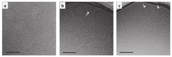 Cryo-TEM images of (a) conventional liposomes and (b,c) iontosomes co-encapsulating cisplatin and docetaxel. The white arrows indicate the interlamellar attachments, which is a defect commonly observed during the formation of bilamellar vesicles. The scale bars represent 100 nm.
