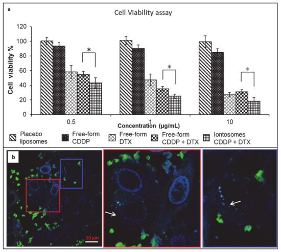 (a) Viability of HeLa cells incubated with placebo iontosomes, free-form cisplatin (CDDP), free-form docetaxel (DTX), their combinations in solution formulation or co-encapsulated iontosomes. The CDDP and DTX concentrations used in solution formulations were similar to those observed in the iontosomes; the DTX concentration ranged from 0.01 to 10 μg/mL, the corresponding CDDP concentrations were 0.013 to 12.8 μg/mL. Cell viability was determined by the MTT assay. Untreated cells were used as controls. The results are expressed as mean ± standard deviation of five measurements. (b) Confocal images showing the adhesion and uptake of fluorescent iontosomes by HeLa cells. The white arrows in the magnified views show the transport of iontosomes to the cell nuclei. (*, p < 0.05).