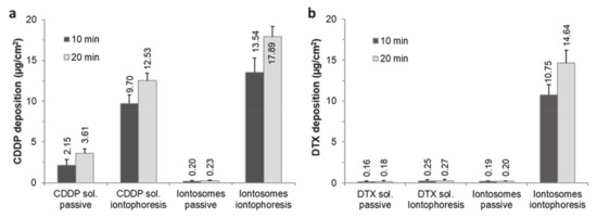 Mucosal deposition of (a) CDDP and (b) DTX following passive diffusion or co-iontophoresis (at 0.5 mA/cm2) for either 10 or 20 min using their aqueous solutions (at pH 7.0) or co-encapsulated iontosomes. The CDDP and DTX concentrations were 0.84 and 0.66 mg/mL, respectively. The results are expressed as mean ± standard deviation of four measurements.