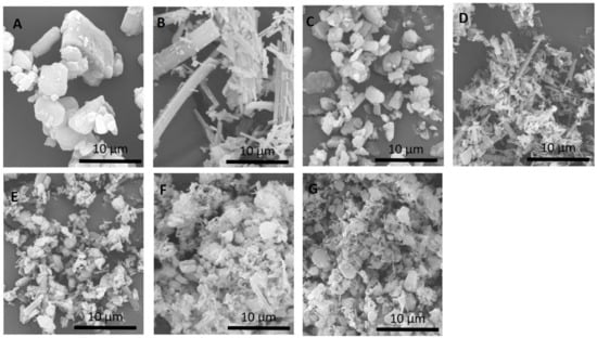 SEM images of (A) raw CUR, (B) raw PTX, (C) jet-milled CUR, (D) jet-milled PTX and the combination of milled CUR/PTX at different ratios ((E) 25CUR:75PTX, (F) 50CUR:50PTX and (G) 75CUR:25PTX). It should be noted that 25CUR:75PTX refers to the combination with the ratio of CUR to PTX at 25:75. CUR: curcumin; PTX: paclitaxel.