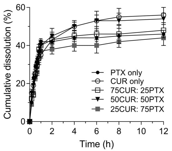 Figure 1 shows the changes in particle size and morphology of samples before and after the milling process. Before the milling process (Figure 1A), CUR particles exhibited a crystalline structure that is heterogeneous with a size of ~22 µm. No significant changes in particle morphology could be observed for CUR after the milling. A reduction in the size and length of CUR crystals is observed (˂5 µm) after milling (Figure 1C). Meanwhile, the PTX particles (Figure 1B) before milling were elongated needle-like crystals of ~42 µm in length. A heterogeneous mixture of particle size of PTX was observed after milling, and significant agglomerations of particles are also noted (Figure 1D). The physical mixing of jet-milled PTX and CUR at varying ratios revealed a homogenously blended formulation (Figure 1E–G). Laser diffraction analyses showed that all the formulations have similar size distributions, in which the d90 and d10 ranged between 4.9 and 5.7 µm and 0.9 and 1.5 µm, respectively (Table 1). In the blend homogeneity experiment, it is demonstrated that the co-jet-milled samples are within the acceptable range, whereby not more than one individual sample was outside the limits of 85 to 115% of the average content. As observed by Lau et al., the jet-milling procedures resulted in the simultaneous mixing and micronization of samples, which led to a homogeneous distribution of drugs [15]. The results of dissolution studies of CUR alone, PTX alone and the combination of CUR/PTX at varying ratios under controlled conditions are illustrated in Figure 2. The dissolutions of CUR alone and PTX alone exhibited similar patterns, whereby approximately 50% of the drugs were dissolved after 12 h. Our data accord with other published findings under similar controlled conditions [16,17]. In addition, the dissolutions of combination formulations also followed similar trend. No significant differences in the amounts of dissolved drugs were observed for all tested formulations.