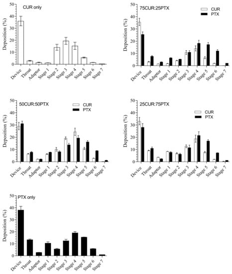 The in vitro evaluation of the aerosol deposition patterns of the DPI formulations using the NGI is shown in Figure 3. The deposition in the device ranged from 30 to 40% for all samples in general (Figure 3). This could be due to the cohesive nature of the CUR/PTX microparticles, which promoted agglomeration and hence poor dispersion. No significant changes in the deposition pattern of each formulation (CUR and PTX) in throat, adaptor and NGI stages were observed, which suggested that the combination formulations were homogeneously mixed. Minimal deposition in the throat and adaptor was observed for CUR alone using high-resistance devices. The effect is more pronounced when the ratio of PTX is increased; for instance, the CUR deposition in the throat increased from 2.9 ± 0.3% (CUR alone) to 9.5 ± 0.3% (25CUR:75PTX) (Figure 3). An increase in the surface area of milled particles coupled with the irregular needle-like shape might have increased the electrostatic interactions and cohesiveness between PTX and CUR. Therefore, this reduced the de-agglomerations of particles after fluidization and increased the depositions in the throat and adaptor. When the high-resistance RS01 device was used, the FFP and MMAD for aerosolized CUR alone were 69.5 ± 1.0% and 3.00 ± 0.05 µm, respectively (Table 2). No significant differences in the aerosol characteristics for CUR for the low-resistance RS01device were observed (p < 0.05, results not shown). Meanwhile, the FFP and MMAD for aerosolized PTX alone were 60.4 ± 1.5% and 2.85 ± 0.10 µm, respectively (Table 2). For all combination formulations, the FPF values ranged between 60 and 70%, with 50% of the population below 3.12 µm in size (Table 2). The ED values of CUR fractions for the 100CUR, 75CUR:25PTX, 50CUR:50PTX and 25CUR:75PTX are 6392.6 ± 254.6 µg, 4887.6 ± 195.0 µg, 3557.0 ± 150.0 µg and 1600.0 ± 40.0 µg, respectively (Table 3). Meanwhile, for PTX, the corresponding ED values for 100PTX, 75CUR:25PTX, 50CUR:50PTX and 25CUR:75PTX are 6044.2 ± 184.2 µg, 1755.8 ± 37.0 µg, 3429.4 ± 140.4 µg and 5263.0 ± 160.0 µg, respectively.