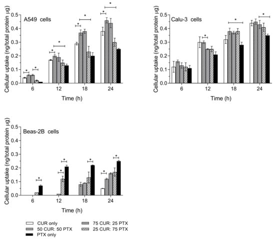 The quantitative cellular uptake of PTX, CUR and the combination of CUR/PTX as a function of time is shown in Figure 4. It was demonstrated that the cellular uptake of PTX alone for both cancer cell lines was the lowest and was statistically significant compared to other formulations containing CUR. For A549 cells, the combinations of CUR and PTX at the ratios of 75:25 and 50:50 demonstrated the highest cellular uptakes followed by the CUR alone and 25CUR:75PTX formulations. This trend was observed at all the tested time points. The cellular uptakes for 75CUR:25PTX and 50CUR:50PTX formulations at 24 h were not statistically significant at 0.46 and 0.44 ng/mg total protein, respectively. However, the drug internalization was significantly higher (p < 0.05) than other formulations. In comparison, the cellular uptakes for 25CUR:75PTX, CUR alone and PTX alone were 0.30, 0.38 and 0.25 ng/µg total protein, respectively (Figure 4). As calculated with Tukey post-hoc test, the p value for the cellular uptake of 75CUR:25PTX and 50CUR:50PTX was p = 0.43. Meanwhile, the p values for 75CUR:25PTX compared with 25CUR:75PTX, CUR alone and PTX alone were p = 0.001, 0.018 and < 0.001, respectively. For Calu-3, there were no statistical differences in the cellular uptake for all the samples at 6 h. The concentrations of the internalized drug ranged from 0.11 to 0.16 ng/µg total protein. As the cell uptake was prolonged to 24 h, it was noted that the cellular uptake of PTX was significantly lower compared to other formulations at 0.35 ng/mg total protein. The p values of PTX compared to 75CUR:25PTX, 50CUR:50PTX, 25CUR:75PTX and CUR alone were p < 0.0001, 0.0013, 0.0248 and 0.0003, respectively. At 24 h, the drug uptakes for formulations containing CUR ranged between 0.41 and 0.45 ng/µg total protein. A statistically higher PTX internalization into Beas-2B compared to all other formulations was noted, which supported the cytotoxic effect of PTX against healthy cells. In comparison, for CUR alone, the internalized drug content was only detected at 24 h.