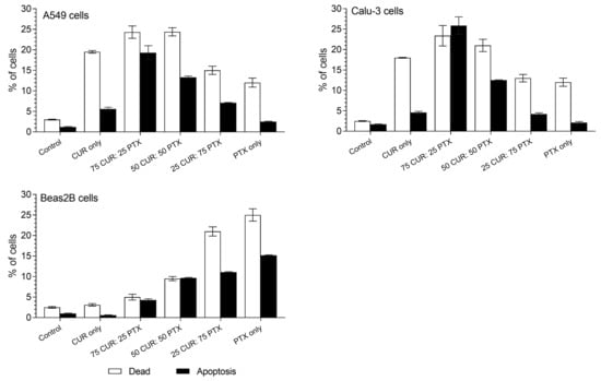 Besides this, the induction of apoptosis in Beas-2B further supported the MTS cytotoxicity data, whereby PTX alone caused a significant increase in cell death (25%) and apoptosis (15.2%) compared to untreated cells (2.5% death; 1% apoptotic). CUR alone did not exert a statistically significant increase in cell death and apoptosis compared to untreated cells. CUR seemingly acted to protect Beas-2B cells from significant cell damage, as is evident from the low cell death populations for the 75CUR:25PTX and 50CUR:50PTX formulations. Meanwhile, when the combination of CUR/PTX contained a higher proportion of PTX, the protective effect of CUR was diminished. Approximately 21% of the Beas-2B cell populations were dead, and 11.1% were in the apoptotic state (Figure 5).