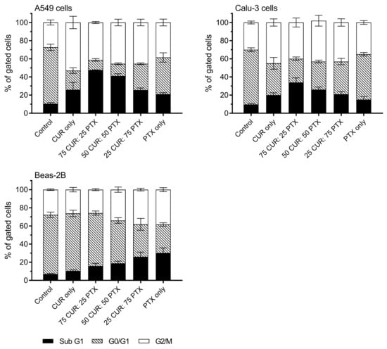 The cell cycle analysis showed an increase in G2/M and Sub G1 in both Calu-3 and A549 cells for all treatments. The percent values of G2/M of untreated cells in the Calu-3 and A549 cells were 30.0 ± 1.6% and 27.4 ± 2.8%, respectively (Figure 6). The G2/M population in A549 cells after treatment was significantly higher compared to the untreated control, and the following order was observed: CUR alone (53.0 ± 6.8%, p < 0.0001) ˃ 50CUR:50 PTX (45.5 ± 3.0%, p < 0.0001) ˃ 25CUR:75PTX (43.5 ± 3.6%, p < 0.0001) ˃ 75CUR:25PTX (41.2 ± 1.1%, p < 0.0001) ˃ PTX only (38.5 ± 3.7%, p = 0.0231). All formulations also resulted in high A549 cell death, as indicated in the higher sub-G1 populations. It should be noted that the combination formulation with higher CUR ratio (i.e., 75% CUR and 50% CUR) was more effective in inducing cell deaths in both the A549 and Calu-3 cells. For Calu-3, a similar trend was observed in which all formulations induced higher G2/M arrest and sub-G1 populations. As for Beas-2B, it is interesting to note that the CUR, 75CUR:25PTX and 50CUR:50PTX formulations did not induce any significant G2/M arrest compared to the untreated cells. Consistent with the MTS assay, the treatment of Beas-2B with PTX caused a significant increase in sub-G1 populations from 7.0 ± 0.6% to 30.3 ± 5.16% (p < 0.0001) (Figure 6). Several studies have demonstrated that CUR and PTX inhibited the proliferation of cancer cells by interrupting the cell cycle process [9,35]. Specifically, PTX inhibits the replication transition from G0 to G1 and induces G2/M arrest [9]. Meanwhile, CUR is involved in the inhibition of the premitotic G2 and mitotic phase of the cell cycle. CUR also acts to induce apoptosis/necrosis in cells, such as the tumor suppressor p53 [36]. In our cell cycle data, CUR and PTX, either administered alone or in combination, consistently inhibited cell proliferation via the induction of G2/M arrest leading to apoptotic/necrotic death.