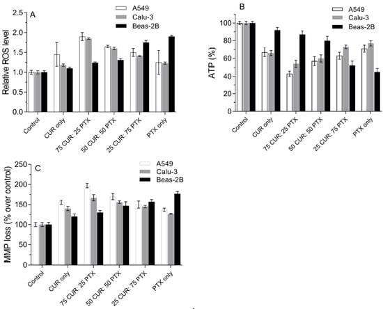 The metabolic reprogramming in cancer cells often leads to the hyperpolarization of the mitochondrial membrane to accommodate the higher ATP demand for rapid cell proliferation and tumor progression [46,47]. From the cancer treatment perspective, the effectiveness of chemotherapeutic drugs could be determined by measuring the mitochondrial dysfunction using mitochondrial membrane potential (MMP). The reduction in MMP in cancer cells, apoptosis, and cytochrome C release into cytosol are indicators of mitochondrial dysfunctions [48]. As is shown in Figure 7C, all formulations resulted in the depletion of MMP in A549, Calu-3 and Beas-2B cells. As PTX is inherently toxic towards Beas-2B, it is anticipated that the MMP loss in Beas-2B would be a few magnitudes higher compared to CUR. As expected, the percentage of MMP loss over control in Beas-2B for CUR alone (120 ± 7%) is significantly lower than PTX alone (177 ± 5%), which is an indication of lower cells depolarization and toxicity. Instead, CUR alone is more able to promote MMP depolarization in both A549 and Calu-3 compared to PTX alone. These findings corroborated with the MTS and apoptosis results, which suggested CUR/PTX-induced mitochondrial dysfunction. Jung et al. reported that CUR caused a dose-dependent reduction in MMP coupled with suppressed mitochondrial oxidative respiration [49]. Many studies have observed that CUR is responsible for the damage of mitochondria, which leads to increased proton leak, the depolarization of MMP and the subsequent initiation of apoptosis [49,50]. As expected, the combination formulation with the highest CUR ratio demonstrated the highest MMP loss in both A549 (197 ± 6%) and Calu-3 (167 ± 8%). Although the reduction in CUR ratio in the combination formulation resulted in reduced MMP loss, it was still more effective than CUR and PTX alone (Figure 7C). Hossain et al. showed that the dual treatment of PTX and CUR induced a higher mitochondrial release of cytochrome C from human glioblastoma cell lines (LN18 and U138MG) [51]. In another study, the co-loading of PTX and CUR onto graphene oxide also provided a synergistic effect on MMP depletion in A549 and MDA-MB-231 cells [39].