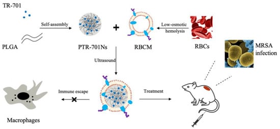 In this study, TR-701 was encapsulated into PLGA nanoparticles and wrapped with RBCM to form RBCM coated-TR-701 loaded PLGA nanoparticles (RPTR-701Ns) according to Figure 1. The RPTR-701Ns were characterized and evaluated for their antibacterial efficacy and safety both in vitro and in vivo. The proposed delivery system was obtained through a relatively simple method, and it has been verified both in vivo and in vitro to possess high bio-compatibility and antibacterial efficacy with toxins adsorption capability.