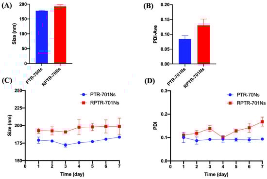 Characterization of nanoparticles. (A) Particle size, (B) PDI, (C) particle size and (D) PDI change in 7 days at room temperature of PTR-701Ns and RPTR-701Ns. Data were presented as the mean ± SD (n = 3).