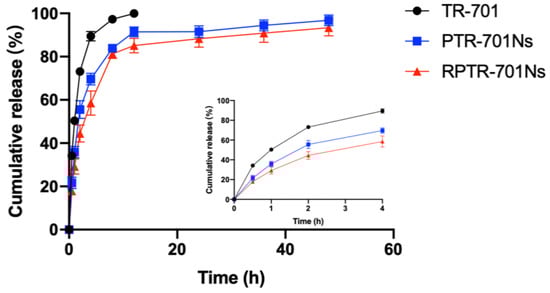 In vitro release of TR-701, PTR-701Ns and RPTR-701Ns. Data were presented as the mean ± SD (n = 3).