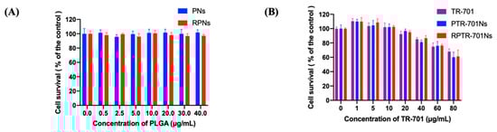 For the cytotoxicity of nanoparticle materials, PLGA nanoparticles (PNs) and RBCM coated PLGA nanoparticles (RPNs) were prepared without TR-701, and diluted with DMEM complete medium with 0.5, 2.5, 5, 10, 20, 30, 40 μg/mL PLGA concentration. For drug loading nanoparticles, TR-701, PTR-701Ns and RPTR-701Ns were diluted with DMEM complete medium with TR-701 concentration of 1, 5,10, 20, 30, 40, 80 μg/mL. HEK 293 cells (approximately 2 × 105 cells/mL, 100 μL) were seeded in 96-well plates for 24 h at 37 °C. The DMEM medium was then removed and 100 μL of the samples were added and incubated with the cells for another 24 h incubation. Afterward, 100 μL of CCK-8 solution (1:9 v/v diluted with DMEM complete medium) was added. After 2 h incubation, the plates were tested for optical density (OD) at 450 nm (600 nm for reference) through a microplate reader (Diken Trading Co. Ltd., Shanghai, China). Cells cultured with only DMEM complete medium was set as a control group. DMEM complete medium was set as a blank group. The cell survival ratio was calculated according to the following formula: