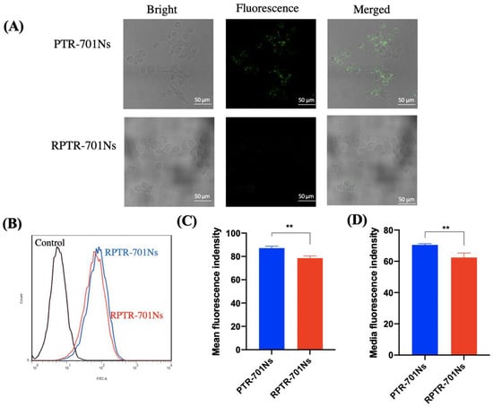 After being coated with RBCM, it is necessary to make sure whether RPTR-701Ns possess the biomimetic property of RBCM with high immune-compatibility []. Capability of immune-escape helps drug loaded nanoparticles to circulate longer, and thus, deliver more drug at targeted site. A macrophage uptake study was carried out by anti-phagocytosis against Raw 264.7 cells. In order to track the nanoparticles, PLGA was labelled with DiO (a lipophilic membrane dye). The fluorescence intensity of the RPTR-701Ns group was significantly reduced in comparison with the PTR-701Ns group by LSCM (Figure 7A). By quantitation, Figure 7B indicated smaller offset of fluorescence of RPTR-701Ns (red) than PTR-701Ns (blue). The mean fluorescence intensity of PTR-701Ns and RPTR-701Ns groups were 87.1 and 78.53, and the median fluorescence intensity were 70.53 and 62.43, respectively (Figure 7C,D), showing a significant decrease of uptake of RPTR-701Ns. Both results of LSCM and the flow cytometer proved that after being coated with RBCM, RPTR-701Ns could help nanoparticles avoid macrophage uptake, which may be related to the existence of particular proteins on RBCM [].