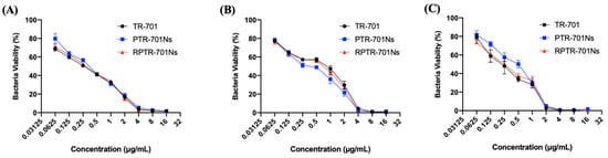 In vitro anti-bacteria efficacy of nanoparticles against, (A) MRSA USA 300, (B) MRSA ATCC 43300 and (C) MSSA NTCT 8325. Bacteria were administrated with TR-701, PTR-701Ns and RPTR-701Ns at different TR-701 concentrations. Data were presented as mean ± SD (n = 6).