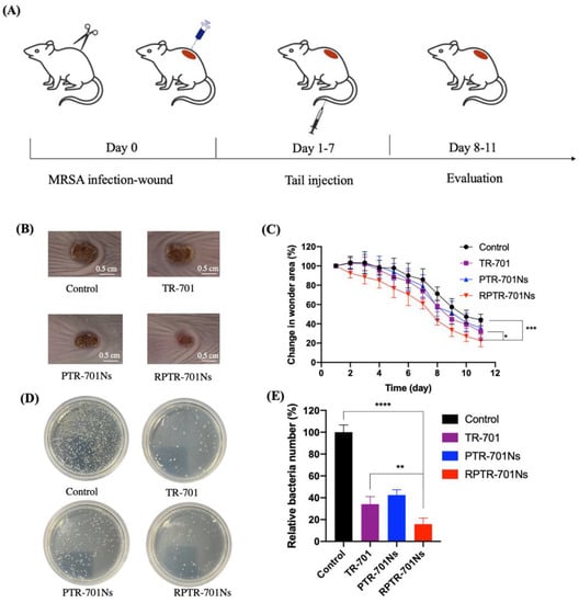 Furthermore, the skin of the wound was collected and then spread on LB plates to quantify the member of the bacteria colony remaining in the wound. As shown in Figure 10D,E, the colonies grown on the plates of the RPTR-701Ns group were significantly less than the rest groups. The RPTR-701Ns group significantly inhibited MRSA growth and showed a synergistic antibacterial activity of both RBCM and the drug. On one hand, RBCM helped RPTR-701Ns to achieve the effect of absorption of exotoxins, which was also verified by in vitro experiments. On the other hand, RPTR-701Ns have a sustained release of TR-701 compared to the naked drug. It was speculated that PTR-701Ns were cleared by macrophages in vivo. But with the coating of RBCM, RPTR-701Ns maintained a longer circulation in vivo, so as to promote the aggregation of the drug at infected site and achieve a better therapeutic effect [].