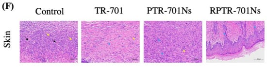 To evaluate in vivo anti-bacterial efficacy, MRSA USA 300 wound infection model was established. We demonstrated TR-701, PTR-701Ns and RPTR0701Ns with same amount of drug at same dosing interval to investigate difference on therapeutic effects of different dosage forms. After 11 days of treatment, a better wound healing rate in the group treated with RPTR-701Ns was showed (Figure 10B,C). At the end of the treatment period, the wound areas of RPTR-701Ns group was just about 22.65% of the initial wound area, which was dramatically lower than the control and TR-701 group which were 44.01%, and 32.13%, respectively. The facilitated wound healing indicated a better therapeutic effect of TR-701Ns.