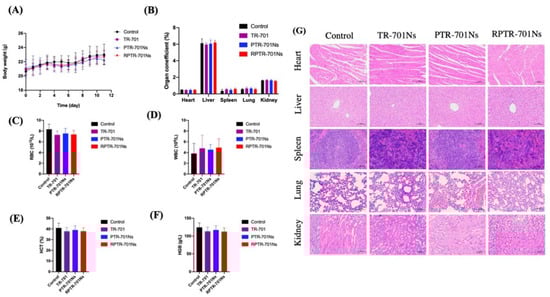 In vivo safety of the treatment. (A) Body weight changes in different groups during the treatment. (B) Organ coefficients. (C) RBCs, (D) WBCs, (E) HCT, (F) HGB, (G) H&E staining of main organs. Data were presented as mean SD (n = 6).