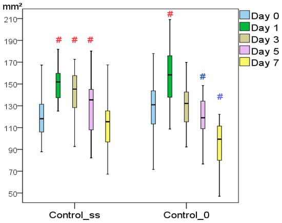The wound area dynamics of the Control_0 and Control_ss groups throughout the study (# difference in indicators relative to Day 0 within one group at p < 0.05; the Wilcoxon test).