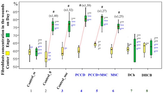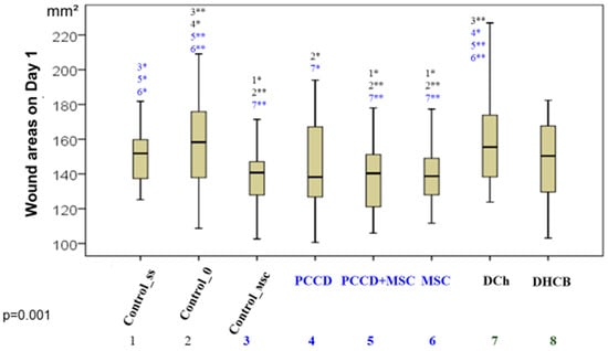 The wound areas in the different groups by the end of the 1st day of the study (* significant difference in the indicator between the Css (1), C0 (2), Control_msc (3), PCCD (4), PCCD + MSC (5), MSC (6), DCh (7), and DHCB (8) groups at p < 0.05; ** p < 0.01; Kruskal-Wallis test).