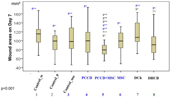 The wound areas in the different groups on Day 7 (* significant difference in the indicator between the Css (1), C0 (2), Control_msc (3), PCCD (4), PCCD + MSC (5), MSC (6), DCh (7), and DHCB (8) groups at p < 0.05; ** p < 0.01; Kruskal-Wallis test).