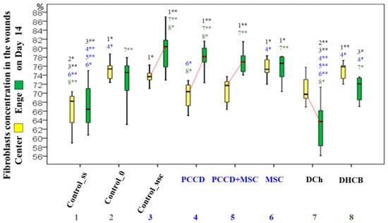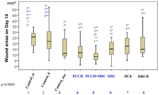 The wound areas in the different groups on Day 14 (* significant difference in the indicator between the Css (1), C0 (2), Control_msc (3), PCCD (4), PCCD + MSC (5), MSC (6), DCh (7), and DHCB (8) groups at p < 0.05; ** p < 0.01; Kruskal-Wallis test).