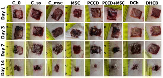 On Day 14, the groups were ranked by wound area from worst to best: Css < C0 < DHCB = DCh < PCCD = Control_msc = MSC < PCCD + MSC (Figure 5).