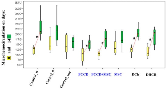Microhemocirculation dynamics on Days 0 and 14; # difference within a separate group relative to Day 0 at p < 0.05 (the Wilcoxon test).