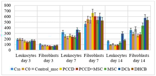 On Day 14, the total number of all cells decreased significantly, 1.5-fold on average, compared to Day 7 (1.1- to 3.1-fold in the center and 1.1- to 3.2-fold in the edges). The number of leukocytes decreased in particular, which correlated directly with the reduction in the wound area size. The ratio of central-to-edge cells leveled off, indicating the same intensity of regenerative processes in all parts of the wound. The greatest decrease was observed in the center and edge cell populations in the groups treated with polymeric agents (PCCD, 2.98-fold; PCCD + MSC, 2.04-fold; p < 0.05). The smallest change was seen in the DCh and DHCB groups. The highest concentration of leukocytes was recorded in the DCh group; the concentration of fibroblasts on the 14th day was 2.9 times higher than that of the leukocytes, reaching the maximum as the latter were eliminated. The concentration of fibroblasts was higher in smaller wounds. In the MSC and DHCB injection groups, the number of fibroblasts in the center and edge tissues was higher than in the Css group, which was reflected in the general and morphological records. The non-invasive groups did not differ from C0 for this parameter. The exception was for wounds in the DCh group, the edges of which contained a significantly lower percentage of fibroblasts than those in other groups (Figure 12).
