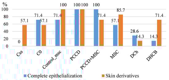 The morphometric results correlated with better healing outcomes. By Day 14 in the PCCD + MSC and PCCD groups, 100% of the wounds were epithelialized (all sections covered with stratified keratinizing epithelium), and we observed the largest number of formed skin derivatives (86–100%) as well as the best formation and maturation of the collagen matrix (Figure 13).