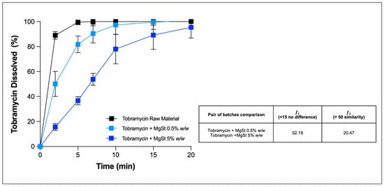 Here, as an example, we present the investigation of tobramycin-based powders coated with magnesium stearate (MgSt) with the aim of slowing down the dissolution profile of the drug. Tobramycin, as a free base, is an aminoglycoside antibiotic freely soluble in water (1000 mg/mL) used for the local treatment of lung infection in patients with cystic fibrosis. The rationale for decreasing the release rate of the drug after deposition in the airways was to sustain tobramycin local concentrations at the infection sites above its minimum inhibitory concentration (MIC) for longer periods. The results demonstrate that the addition of increasing proportions of MgSt (0.5–5% w/w) slowed the tobramycin dissolution rate compared to that of the reference formulation, for which almost 90% of the drug dissolved after only 2 min. In particular, the powder containing 5% w/w of MgSt showed a significantly slower profile than the powder with 0.5% (Figure 2), as confirmed by the results of difference (𝑓1) and similarity (𝑓2) factors (52.19 for 𝑓1 and 20.47 for 𝑓2). At the end of the experiment, both formulations released >96% of the drug deposited as bulk formulation on the glass fibre membrane, while the small residue still present in the donor was attributed to the presence of the insoluble MgSt.