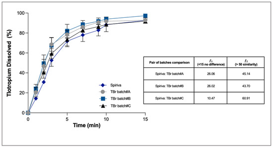 Owing to its high aqueous solubility (25 mg/mL), 80% of the tiotropium dissolved within 15 min in all the experiments (Figure 5). At the end of the dissolution, in all cases the percentage of tiotropium bromide recovered in the donor and trapped in the filter was not more than 7%. Statistical analysis made it possible to determine that only one test formulation (TBr Batch #C) had a dissolution profile statistically similar to that of Spiriva (the difference factor was 10.5 and the similarity factor was 60.9).