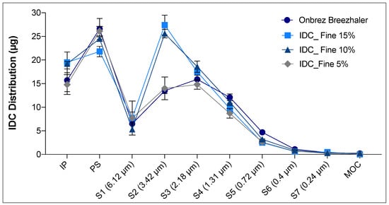 Indacaterol DPI (150 µg/25 mg of blend) distribution in the NGI after a single dose aerosolisation. Three batches containing different amounts of fine lactose (IDC_Fine 5%, IDC_Fine 10%, IDC_Fine 15%) were compared with Onbrez (n = 3, mean ± SD). Upper cut-off diameter of stages (S) is reported in the brackets, (IP = induction port, PS = pre-separator and MOC = micro orifice collector).
