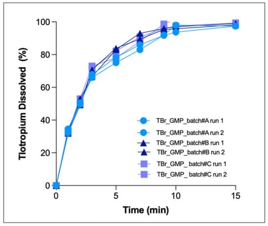 Dissolution tests were performed in duplicate for the three GMP batches, and all single runs are shown in Figure 9. As above, only the respirable fraction was tested, and PBS with 0.25% EDTA was used as dissolution medium.