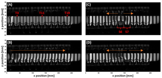 Figure 2. MR Tagging applied to the dynamic colon model (DCM) filled with 200 mL LOVIS fluid. ‘Tags’ are the dark stripes across the images. The DCM is orientated such that the caecum is at x = 0 mm, and the hepatic flexure begins at x = 250 mm. (A) Coronal image showing no movement inside the DCM before motility is initiated. The tags are straight, parallel and intact. (B) Tagged image during contraction of the first DCM segment. Tags are shifted in the positive x-direction showing a wave of antegrade flow travelling through the lumen. (C) and (D) Tagged images of the DCM during contraction of segment 6, showing antegrade flow in the immediately downstream tag at early stages of contraction (C) and stronger retrograde flow in all adjacent tags (D). The arrows drawn onto the images are to aid visualisation of the direction of tag displacement and therefore motion of the contents. Tags (T) 3, 11 and 19, and segments (S) 6 and 7 are labelled as these were the focus of velocimetry studies in Section 3.2 and Section 3.3.