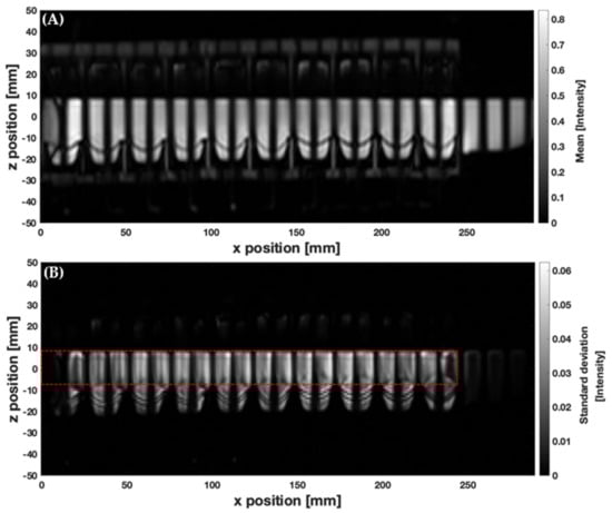 To measure motion of the contents of the human AC, Pritchard et al. [20] analysed standard deviation maps within a region encompassing the AC, calculated over a sequence of tagged images. Applying this technique to the DCM, a region of interest (ROI), R, was drawn, enclosing the lumen at the neutral wall position (outlined in Figure 3B) to focus measurements on the motion of fluid inside the lumen rather than fluids inside the haustra, used for the pneumatic control of wall motion. Those voxels within R which experience variation in the signal intensity during the 60 s of data acquisition have a relatively large standard deviation of intensity, whereas static structures (DCM core structure) or motionless lumen contents have a standard deviation close to zero. Therefore, the resulting standard deviation map highlights any motion of the DCM lumen contents. The standard deviation map can also reveal where the motion is concentrated. The mean signal intensity (MIR) and standard deviation (STDEVR) maps were calculated using MATLAB (R2019B, The MathWorks, Inc., Natick, MA, US) over 100 frames. The coefficient of variation (CoV) for the tagged scan was then estimated from: