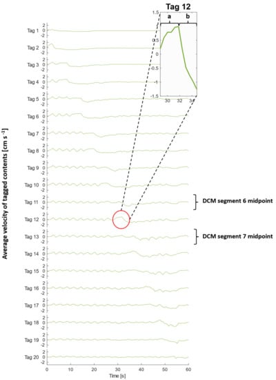 The highest average antegrade velocity was recorded to be 1.50 ± 0.20 cm·s−1 for tag 2 after contraction of the first segment. The average retrograde velocity peaked at −1.50 ± 0.20 cm·s−1 for tag 11 at time t = 34.8 s. Given the extent of retrograde activity, it would be expected that the net aboral propulsion of suspended fluid contents would be poor when subjected to the CPPW, similar to previous observations from studies that applied faster propagating waves in low viscosity media [21,22]. However, it is highlighted in Figure 4 and Supplementary Materials Video S1, that this motility pattern does not generate one continuous wave front in the contents that progress further along the x-axis of the DCM with each contraction, as in recent in silico studies [39]. This was expected as the CPPW was not a fully occluding event, therefore backflow was more prevalent post-contraction.
