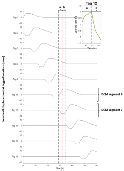 Figure 5. Local wall displacement at each tagged location during a CPPW. Note there is no local wall motion at the location of even-numbered tags due to rigid walls, which have hence been excluded from this plot. The inset graph displays a magnified plot of the velocity of the contents at tag 12 taken from Figure 4, during (a) contraction of segment 6 and relaxation of segment 7 and (b) contraction of segment 7. The black dashed lines bound the timeframe of the inset figure to aid visualisation of local wall motility surrounding tag 12 during the recorded flow event.