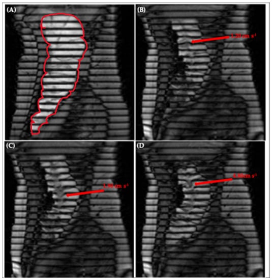Figure 6. Tagging applied to the ascending colon, outlined in red in (A), showing (A) little motion, (B) antegrade flow of 1.20 ± 0.20 cm·s−1 close to the hepatic flexure, (C) retrograde flow of 1.90 ± 0.20 cm·s−1 close to the midpoint of the AC and (D) retrograde ‘jet’ of 4.80 ± 0.20 cm·s−1 close to the hepatic flexure. Images taken from supplementary video S2 of Pritchard et al. [20].