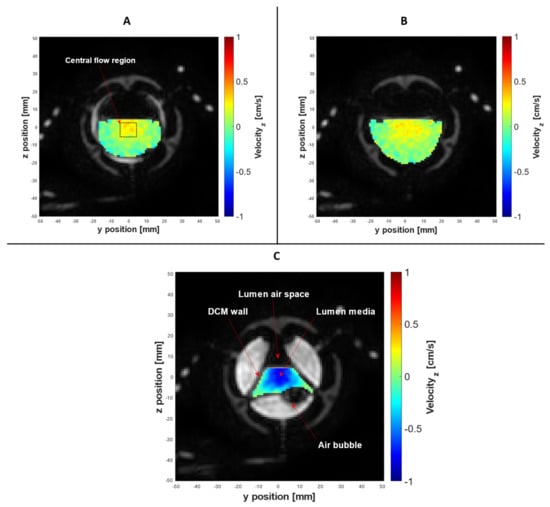 MR tagging has been used to measure velocity in fluid flows, primarily in blood vessels [17] and more recently in engineering systems [18,19]. In both applications however, flows have typically been much faster than those previously measured inside the DCM (which were of the order of 2–4 cm·s−1 [22]) and mostly occurred within far smaller geometries, such as veins or nozzles, and usually with the application of only a single tag. Phase contrast (PC) cine-MRI, described in detail in [31], is also used to measure blood flow [32]. However, PC cine-MRI has also been applied to measure lower velocity cerebrospinal fluid (CSF) flows which are commonly of the order 0.5–5 cm·s−1 [50,51,52,53,54] and therefore much more comparable to flows inside the DCM. Moser et al. [18] compared both techniques to study flow inside a pipe with a step stenosis. It was found that PC cine-MRI gave more accurate results than tagging techniques for flows of <100 cm·s−1. Contrarily, d’Avila found that tagging techniques made accurate measurements for flows as low as 0.1 cm·s−1 inside a concentric cylinder system [19].