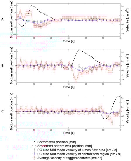 Figure 7B shows the cross section of tag 11 at t = 28 s, depicting the walls in a fully relaxed state, maximising the cross-sectional area of the lumen. This is in line with the beginning of an antegrade flow episode observed in the tagged dataset (Figure 4A). Flow was in the positive x-direction, driven by the immediately upstream DCM contraction, in keeping with the antegrade flow event recorded in the tagged contents. Again, the flow was concentrated in the centre of the lumen close to the free surface. During the relaxation of the walls immediately before the image in Figure 7B, the “pouring mode” described by Alexiadis et al. [43] may occur where significant flows in the z-direction take place; this is not shown, as velocity was encoded only in the x-direction. The tagged dataset in Figure 4 shows a strong peak in negative velocity at t = 35.4 s, aligning with the cross section captured in Figure 7C which shows the walls fully contracted at t = 36.0 s, occluding the lumen and forcing the contents backwards. An established velocity profile is evident, with the highest retrograde velocities in the centre of the lumen and steepest velocity gradients towards the walls.