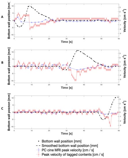 However, analysis proved challenging for the faster CPPW, as tags overlapped with one another, making it difficult to clearly distinguish the displacement of one tag from another without simplification that would greatly interfere with the data. Therefore, the tagging velocimetry methodology equipped with this particular parameter setup in this investigation was only suitable for analysis of the slower motility pattern. In the future, this could be solved through optimisation of the scanning parameters prior to the scan, based on the expected flow rates, for example, increasing the distance between the tags or decreasing the delay time between the application of the tag lines and acquisition of the image in order to capture higher velocity flows. In previous studies, MR tagging has been used to measure flows that are magnitudes stronger [33], using a single tag. Therefore, the use of a multiple tagged scan to identify regions of extreme flow due to erratic motility with pathological roots, followed by the application of a single tag to quantify the extent of the flows, could form a valuable clinical or research tool.