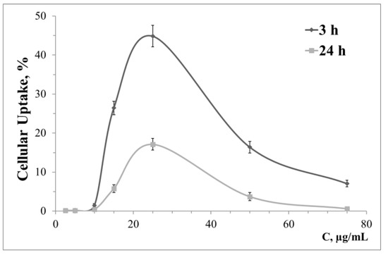 The pattern of cellular uptake varies greatly, both with the cell lines used and for the generation of surface dendrons. Figure 2 shows as an example the dependence of HeLa cell absorption of complexes AuNP14-rndRNA on the concentration of AuNP14. Data for other lines and AuNP are given in the Supplementary Materials. Figures S1 and S2 show the dependence of cellular uptake by HeLa on concentration for AuNP13 and AuNP15 nanoparticles, respectively. Cellular uptake of AuNP13, AuNP14, AuNP15 is shown correspondingly in Figures S3–S5 for the HL-60, Figures S6–S8 cell line for the CEM-SS cell line. At low concentrations, AuNP13 did not penetrate the HL-60 and CEM-SS cells. Significantly different signals from the threshold were observed at concentrations of 75 μg/mL and higher. Complexes with AuNP14 had a low level of cellular uptake after 3 h incubation with the same cells. This level increased significantly after one day of incubation. Accumulation of AuNP13-rndRNA and AuNP14-rndRNA complexes in HeLa cells decreased after 24 h incubation compared to 3 h. With AuNP15, cellular uptake did not change with incubation time over the entire concentration range. Uptake of AuNP15 decreased after 24 h incubation compared to 3 h in HL-60 and CEM-SS cells.