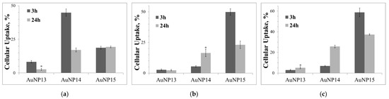 Cellular uptake of complexes with optimal concentrations of AuNP after 3 and 24 hours of incubation in (a) HeLa, (b) HL-60, and (c) CEM-SS. Cells were treated with 100 µg/mL for AuNP13; 25 µg/mL for AuNP14; 10 µg/mL for AuNP15. Used siRNA is rndRNA-FAM (100 nM). Data obtained based on fluorescence intensity from FAM-labeled RNA by flow cytometry. Statistical significance between 3 and 24 h (at * p < 0.001) was estimated by the post-hoc Newman–Keuls test.