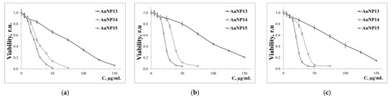 The cytotoxicity of AuNP is directly related to superficial dendrons; higher generation of dendrons caused a more significant decrease in viability in all cases. This effect is readily explained by an increase in the density of the cationic charge on the surface of nanoparticles. Despite cationic charges being required for efficient transfer of genetic material through non-viral vectors, some evidence confirms the high cytotoxicity of such systems. These effects occur for a number of reasons, among which are the violation of the integrity of cell membranes and the generation of reactive oxygen species [38,39]. It is also interesting that at low concentration (<20 μg/mL), cytotoxic effects do not depend on the generation of surface dendrons for the three cell lines used. It seems that only the dimensional properties of nanoparticles are relevant.