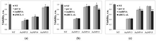 Cytotoxic effect of AuNPs per se and their complexes with target siRNA (siMCL-1 or siBCL-xL and RNA with a random sequence (rndRNA) on (a) HeLa, (b) HL-60, and (c) CEM-SS cells after 72 h incubation. AuNP concentrations correspond to optimal delivery concentrations based on previous calculations (100 µg/mL for AuNP13; 25 µg/mL for AuNP14; 10 µg/mL for AuNP15). Data obtained from MTT assay normalized to untreated cells (NT). Statistical significance between AuNP per se and AuNP-rndRNA (* p < 0.01); AuNP-rndRNA and AuNP-siRNA (** p < 0.005) was estimated by the post-hoc.